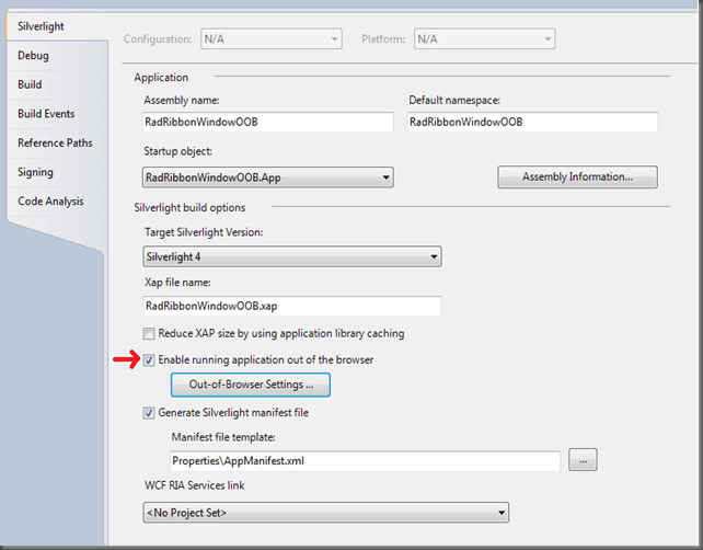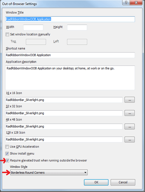 An application that will use the new RadRibbonWindow should be configured to run in out-of-browser mode and also to require elevated trust permissions with one of these options: No Border or Borderless Round Corners (the preferred one). These two steps could be achieved this way:
