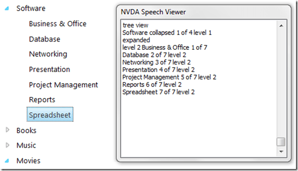 Having them applied, the screen reader can parse the semantics into more meaningful for the user form and present it with respect to a specific action (keypress or mouse click on the TreeView by the user).