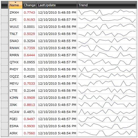 One application of the sparklines is to show financial data. Recently Vladimir Enchev blogged about real-time updates in RadGridView. Since sparklines and grids go hand-in-hand together when visualizing data we decided to prepare a small demo showing how to integrate both controls while still maintaining very good performance: