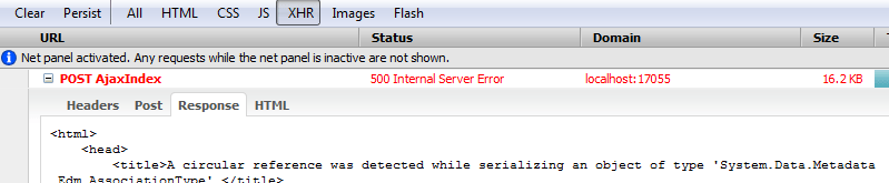 The error message is “A circular reference was detected while serializing an object of type” followed by some type. If you google this up you will find out that this exception is thrown by the JavaScriptSerializer class because of circular references detected. “What the heck is a circular reference anyway?” you may ask. In my example it is the well known Orders-Customers relationship: