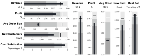 The Bullet Graph is created by Stephen Few and it is designed especially for dashboards. This little wonder is very data intensive and easy to read at the same time. In just one Bullet graph you can demonstrate both what your projected and your accomplished goals for a period are, specify qualitative ranges such as worst, acceptable and good and also display some comparative values. Usually these graphs start at zero for easy comparison, so you can stack a few of them for better representation.
