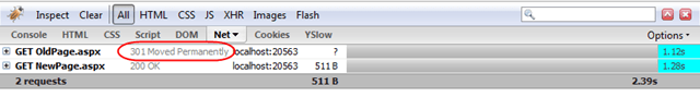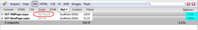 I've created a simple page, OldPage.aspx, which redirects to NewPage.aspx during the Page_Load event. Let's jump into FireBug and see exactly what our response and redirect looks like.