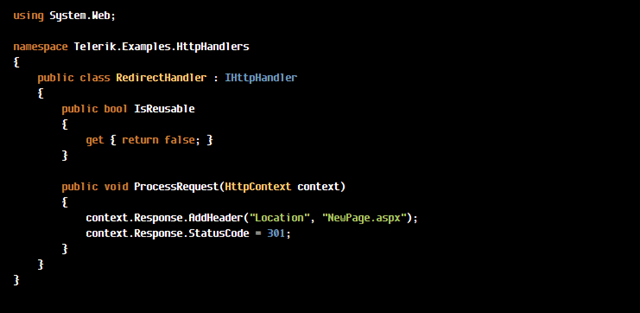 In this example, we will create a class called RedirectHandler. We'll set the IsReusable property to false and add code in the ProcessRequest method to set the status code of the Response object and to add to it a header which will contain the location of the moved resource.