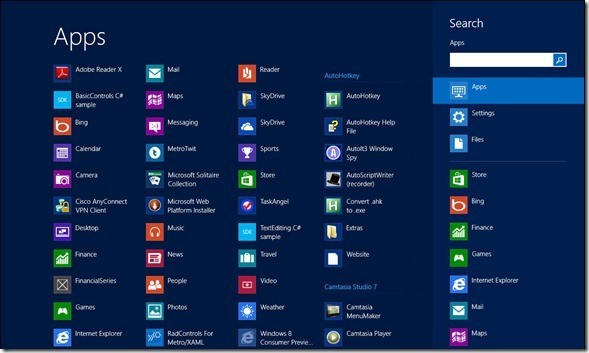When you click search Windows 8 assumes you want to search the current application if that application has registered a Search “contract.” If it has not, Windows 8 will assume you want to search the applications, as shown in the figure (click on the figure for full size).