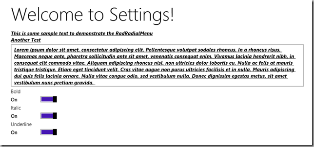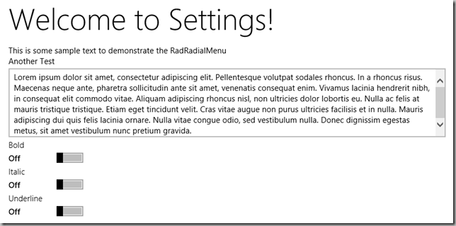 <div id="contentContainer"><div id="menuTarget" contenteditable="true">This is some sample text to demonstrate the RadRadialMenu</div><div>Another Test</div><textarea id="MyTextArea" rows="6" cols="100" width="600px"></textarea></div><div id="fontSettings" class="win-settings-section"><div id="boldSwitch"data-win-control="WinJS.UI.ToggleSwitch"data-win-options="{title:'Bold'}"></div><div id="italicSwitch"data-win-control="WinJS.UI.ToggleSwitch"data-win-options="{title:'Italic'}"></div><div id="underlineSwitch"data-win-control="WinJS.UI.ToggleSwitch"data-win-options="{title:'Underline'}"></div></div>