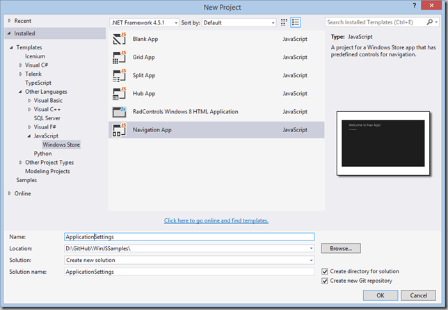 To get started, create a new WinJS Navigation project in Visual Studio 2013 (File->New Project…->Templates->Other Languages->JavaScript->Windows Store->Navigation App, shown in Figure 3). I named mine ApplicationSettings because this sample will also be used for working with Application Settings and the Settings Charm. Although we aren’t going to creating multiple pages, the Navigation app contains all of the layout to be consistent with the Layout Guidelines from Microsoft, and is my goto App Template.