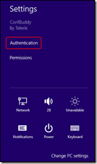 The user slides the Charms into view (or presses Windows-C) and chooses Settings. The user then taps on Authentication and our custom authentication window opens with prompts and TextBoxes to fill in the data we need.