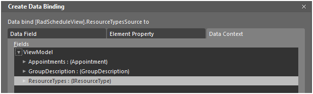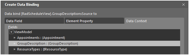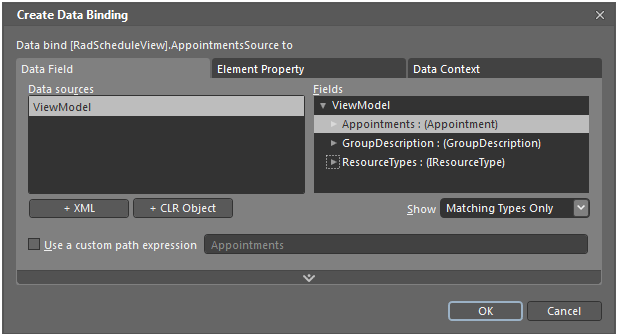 And select the AppointmentsSource as source for the binding for the RadScheduleView’s AppointmentsSource property: