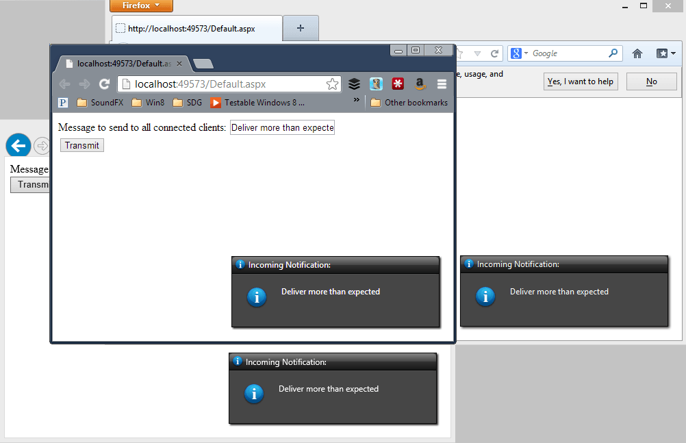 With these snippets of code in place, I can start up several different browsers and transmit a notification to all of them at the same time. Our RadNotification control will immediately display all of the messages.