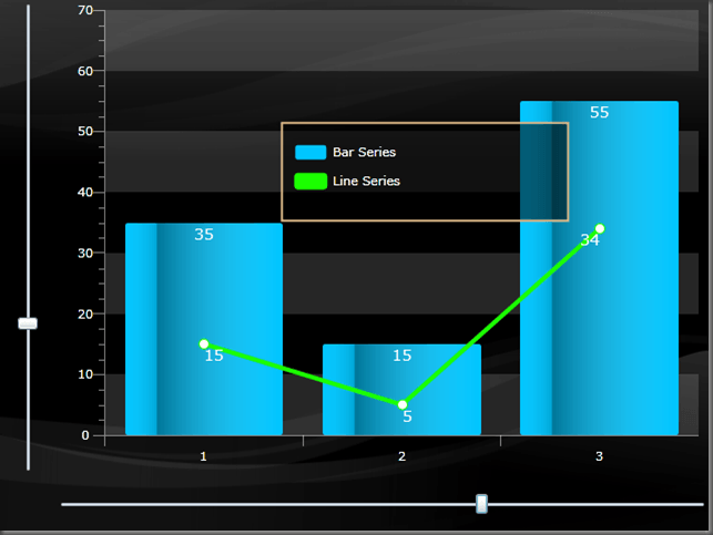 The code above declares a RadChart control with custom grid layout containing a ChartArea populated with two data series and a ChartLegend. There are also two sliders used to precisely position the legend. Following is the result: