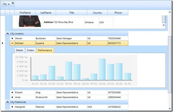 Since there are cases where using nested scrollbars is the better option, we still offer the old behavior by setting the UseScrollbarsInHierarchy property to true. Even in this scenario RadGridView behaves better, because of the new smooth scrolling mechanism. In the previous versions, RadGridView's scrolling was done on row-by-row basis. That is OK when using rows having equal height, but when there are child views, the scrollbar "jumps" and changes it size. Now, this issue is gone and you can smoothly scroll to see just a part of the child view: