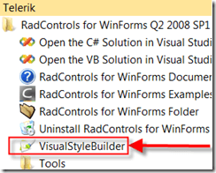 I thought it might be interesting to do a quick rundown of the Visual Style Builder. This tool comes with your Telerik WinForms control suite and provides a quick and easy way to change the look of a control. The Visual Style Builder is located under the Telerik directory in your Start menu.