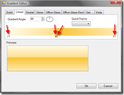Click on the color control and the Gradient Editor will be displayed. The boxes on the bottom of the color scale show the colors used in the gradient for the button. If you double click on a box the color picker is displayed and you can change the color to red. Note: There are two boxes in the middle very close together so make sure you change both of them.