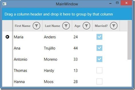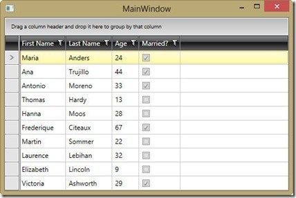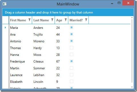 publicstaticObservableCollection<Employee> GetEmployees(){ObservableCollection<Employee> employees =newObservableCollection<Employee>();Employee employee =newEmployee();employee.FirstName ="Maria";employee.LastName ="Anders";employee.IsMarried =true;employee.Age = 24;employees.Add( employee );employee =newEmployee();employee.FirstName ="Ana";employee.LastName ="Trujillo";employee.IsMarried =true;employee.Age = 44;employees.Add( employee );employee =newEmployee();employee.FirstName ="Antonio";employee.LastName ="Moreno";employee.IsMarried =true;employee.Age = 33;employees.Add( employee );employee =newEmployee();employee.FirstName ="Thomas";employee.LastName ="Hardy";employee.IsMarried =false;employee.Age = 13;employees.Add( employee );returnemployees;}