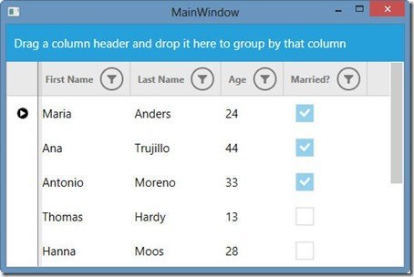 <telerik:RadGridViewName="radGridView"AutoGenerateColumns="False"><telerik:RadGridView.Columns><telerik:GridViewDataColumnDataMemberBinding="{Binding FirstName}"Header="First Name"/><telerik:GridViewDataColumnDataMemberBinding="{Binding LastName}"Header="Last Name"/><telerik:GridViewDataColumnDataMemberBinding="{Binding Age}"Header="Age"/><telerik:GridViewDataColumnDataMemberBinding="{Binding IsMarried}"Header="Married?"/></telerik:RadGridView.Columns></telerik:RadGridView>