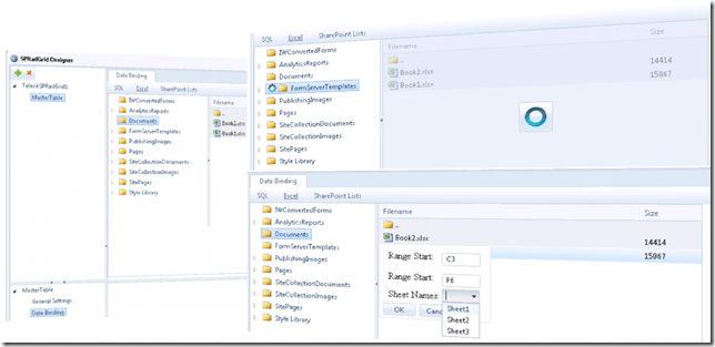 Excel binding for SPRadGrid - in addition to the SP Lists and SQL binding supported by our AJAX grid's SP2010 web part, we introduced option for Excel binding from the SPRadGrid visual designer. This feature can be very useful when you want to access an Excel file in SharePoint 2010 context, visualize the data from it in a table structure and perform sorting, paging, filtering, editing, etc. operations.