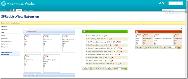 SPRadListView web part - a new web part which hosts our AJAX ListView control. It exposes options to bind the component to SharePoint lists or SQL backend (in the same manner supported by the SPRadGrid web part) and allows design-time listview configuration. The screen shot below illustrates a subset of the predefined layouts for data presentation available out-of-the-box in our SPRadListView web part.