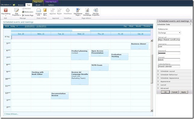 SPRadScheduler web part - the main purpose of this web part is to serve the purpose of the default SharePoint scheduler and extend its read-only presentation with options to edit and insert appointments. Major advantages are design-time configuration to connect to MS Exchange and straight-forward scheduler customization.