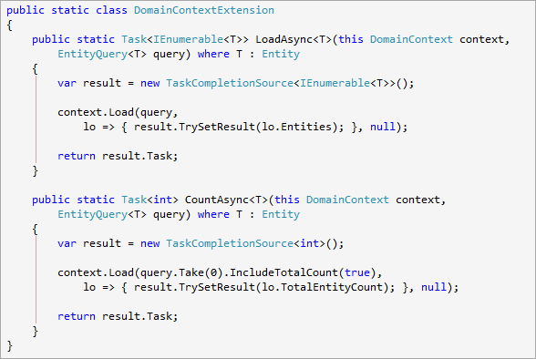To do this I’ve made two extension methods for DomainContext: LoadAsync<T>() and CountAsync<T>().