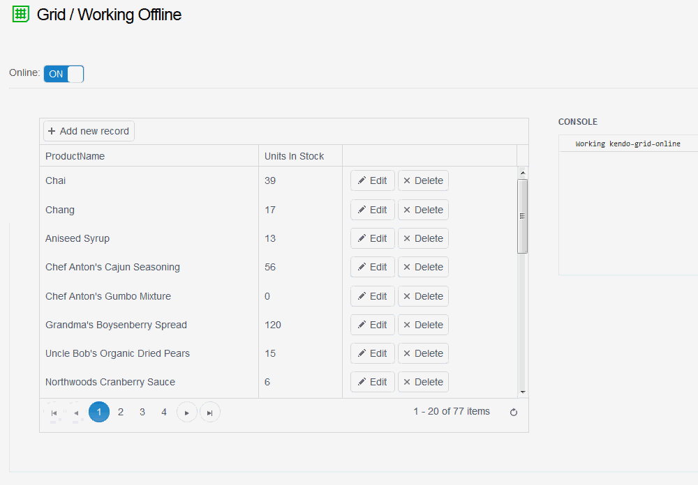 In addition to the existing rich functionality our Kendo UI DataSource already provides, now you don’t have to worry about whether your user is online or disconnected when operating with data. The modifications will be saved locally and automatically synced when the user is back online, saving you the hassle to code these operations manually and preserving the state of the data with your custom logic.