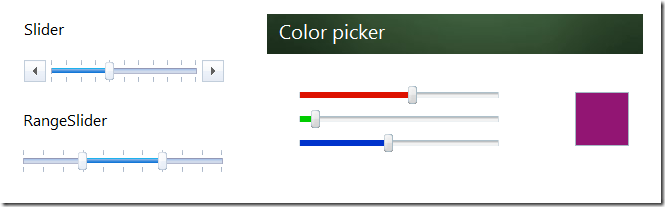 Slider - incorporates integral slider features like selecting value from a defined range, range selection with 2-drag handles, orientation, ticks, etc. Consists of two sub-extensions - Slider and RangeSlider.