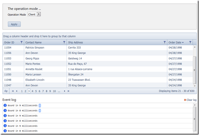 • Client operation mode - This new mode allows operations like sorting, paging, filtering or grouping to be performed purely on the client, by making a single initial call to the server to retrieve all data.