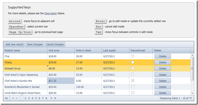 • Keyboard navigation - Useful feature that allows the end user to navigate between the grid rows, cells, or pages, select rows or edit data using solely the keys from the keyboard. What is more, it enhances the accessibility of the control.