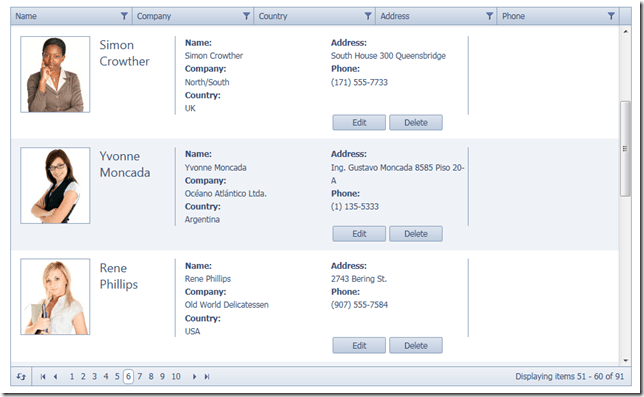 • Global row template - Now you can define the structure of the grid rows in a completely custom manner using template mechanism. Thus you can tailor the look and feel of the rows in par with your own preferences, scrapping completely the predefined table row/cell model. The feature is supported both with server and client templates.