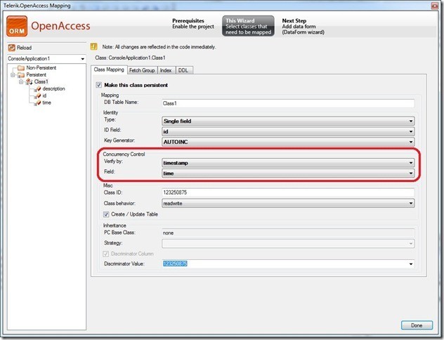 How to set up the backend concurrency control mode depends on the data model classes. In case of an existing schema you should use the Reverse Mapping Wizard, otherwise – Forward Mapping Wizard.