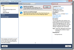 This will launch the package manager dialog, here you can search for OpenAccess in the upper right, and the packages will show up in the list. Click the install button on OpenAccess.CodeFirst and it will be added to the project.