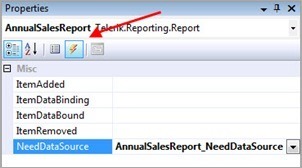 Now that we have two parameters that we can pass to our stored procedure, the last thing we must do is call the stored procedure and bind the results to the report. We can do this by taking advantage of the report’s NeedDataSource event. To add an event handler to this event, go the to report’s events in the Visual Studio Properties window and double-click on the NeedDataSource event. This will add the event handler automatically to your code-behind.
