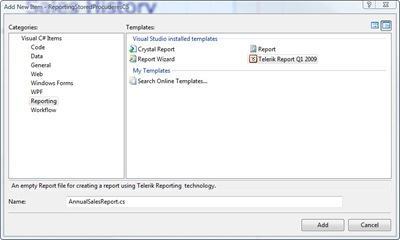 First, create a class library project in Visual Studio and add a Telerik Report item to your project. When you add this item, you’ll be greeted with the Telerik Report Wizard. Go ahead and cancel out of it as we’ll be designing our report manually this time.