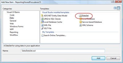 Next, we’ll need to a way to retrieve data from the database using the stored procedure. We could write ADO.NET code, but I prefer to take the easier route and create a DataSet item to my report. To do so, right-click on your project and select Add | New Item… From the Add New Item dialog select a DataSet item, name it SalesDataSet.xsd and click Add.
