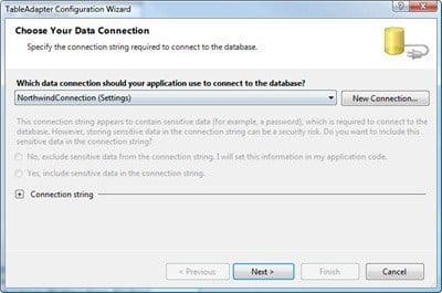 When the new DataSet is generated, you’ll be greeted with a blank design surface. Drag a TableAdapter onto the design surface from your Visual Studio Toolbox. This will launch the TableAdapter Configuration Wizard. On the first page of the wizard, select the connection string you want to use to connect to the Northwind database. If one is not already set up and available in the drop down list, click New Connection… to create a new one.