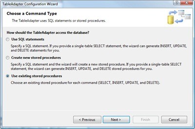 Click Next. On the following page, select the Use existing stored procedures radio button to choose your command type.