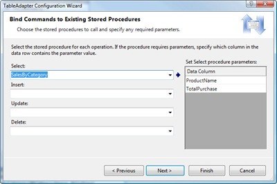Click Next. You’ll be given the option to choose four different stored procedures for CRUD operations. From the Select drop down list, choose the SalesByCategory stored procedure.
