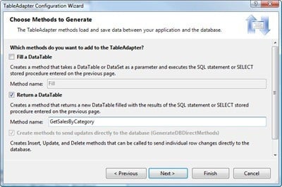Click Next. One the following page you can choose your own method names for methods that will be generated to fill a DataTable or return a DataTable. For the Return a DataTable method name, enter GetSalesByCategory.