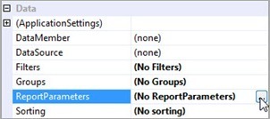 To add two new report parameters to the report, go to your report properties in the Visual Studio Properties window and select the ellipses next to the Report Parameters property.