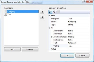 You will be greeted with the ReportParameter Collection Editor. Add two new parameters, with a Name and Text of Category and Year, each of type String. Set the AllowBlank property to False and the Visible property to True. Click OK.