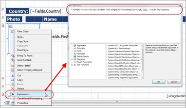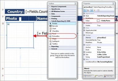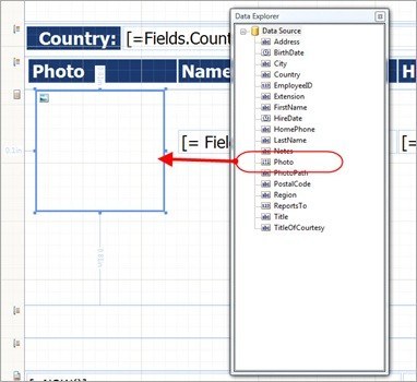 Alternatively, I can drag a PictureBox item onto my design surface and use an expression to set its Value property to the Photo field from my data source.