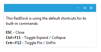 <telerik:RadDock ID="RadDock2" runat="server" AccessKey="H"> <Commands> <telerik:DockCommand Name="customDockCommand" Text="Custom DockCommand" OnClientCommand="onCustomDockCommandHandler" ShortCut="Ctrl+Alt+E"></telerik:DockCommand> </Commands></telerik:RadDock>Yes, it is that simple - just set the AccessKey property of the dock (to allow the users to focus the control) and the ShortCut property of the command and, voila, users can execute dock commands using just the keyboard.
