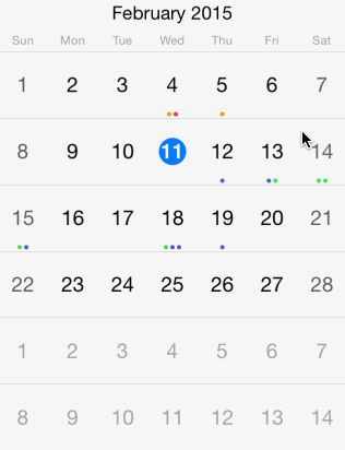 As you know our Calendar for iOS provides indicates if there are events on a particular date. This indication comes in the form of colored dots following the established design of the Calendar app. The end user, however, may need to learn more information about the events, like title and time of occurrence. To make the process of showing this data easy, the Telerik Calendar now provides support for inline events. When you tap on a date cell that has associated events, an inline list of the events opens within the Calendar and shows the titles and the times of the events.
