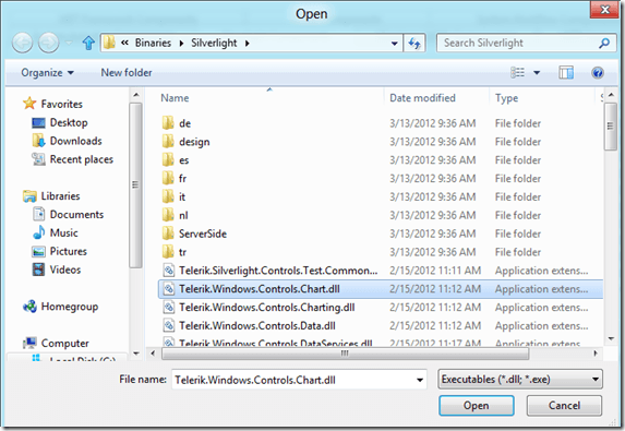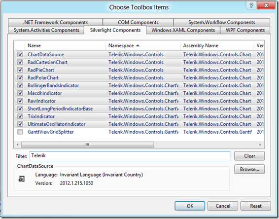 Once the Choose Items dialog has loaded then you can click “Browse” and navigate to the binary folder where the controls reside. In this case, we are creating a Silverlight 5 application so navigate to C:\Program Files (x86)\Telerik\RadControls for Silverlight Q1 2012\Binaries\Silverlight. Go ahead and select the binary of the control you wish to use and click “OK”.