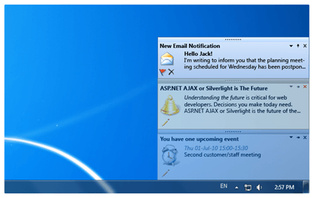 You will be able to find the RadDesktopAlert component in the Q2 2010 Beta release and take a look at what it has to offer. We have also updated our online help so that you will be able to explore the functionality of the control. Any feedback you might have that will help us improve this new control is highly appreciated!