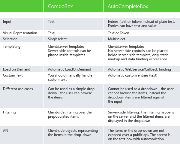 We realize that adding a new control that resembles RadComboBox so closely might be confusing; this is why I will try to emphasize on the strong and weak parts of both controls. Let’s take a look at the comparison table below:
