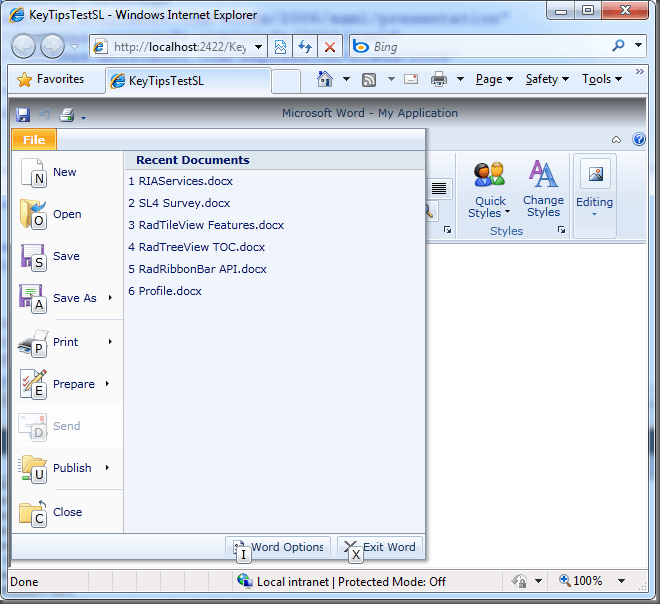 KeyTips are also available for the ApplicationMenu, QuickAccessToolbar, drop down items – DropDown buttons, Split Buttons, Collapsible panels and so forth.