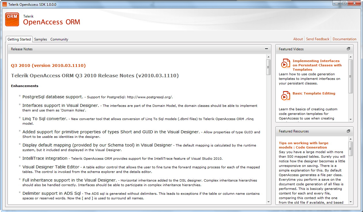 When you start the OpenAccess SDK (from the start menu shortcut) this is what pops up, the Getting Started tab. Here you can find the release notes for the latest version of OpenAccess as well as two extra tiles. The Featured Videos tile as well as the Release notes are directly streamed from our site feeds so you will always have fresh content to look at. And the Featured Resources contains links to articles we think you will find interesting.
