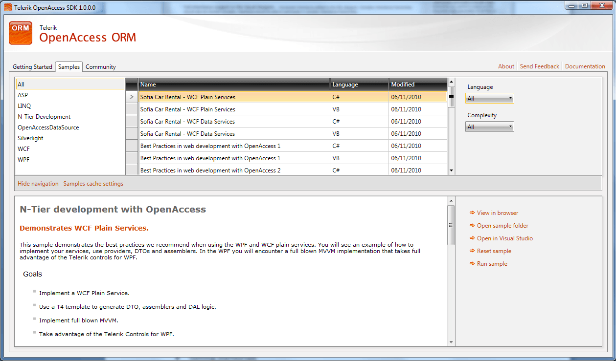 Finally the Open in Visual Studio command will do the same as the Run sample command except instead of running the example it will open it for edit.