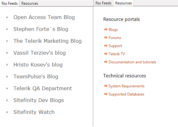 Here you can find side by side the two inner tabs the Rss Feeds and the Resources. The first one is a list of blogs in our community that is aggregated and you can read and the latter contains links to the OpenAccess product site.