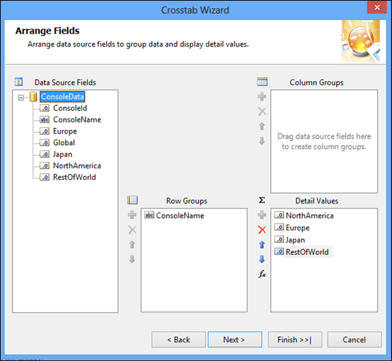 Next drag an instance of the Cross Tab Wizard to the report header directly below your graph and reuse the existing ConsoleData data source. When setting up the fields for the crosstab, drag the ConsoleName field to the Row Group, and drag NorthAmerica, Europe, Japan and RestOfWorld fields to the Detail Values box, also removing the Sum function as you did previously with the graph wizard, then click Finish to add the crosstab to the designer.
